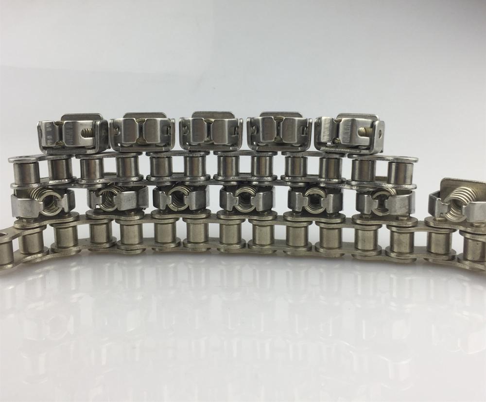 La cadena de agarre para maquinaria agrícola es una cadena que se utiliza para sujetar y transportar tallos de cultivos en maquinaria agrícola, como trilladoras automáticas y cosechadoras de cereales semialimentadoras. Por lo tanto, este tipo de cadena también se conoce como cadena de alimentación de maquinaria agrícola, cadena trilladora, y la cadena de sujeción se divide en una estructura de cadena sin manguito y una estructura de cadena interna con una cadena de manguito. Las cadenas de sujeción se utilizan mucho en las cosechadoras de arroz. La estructura básica de la cadena es similar a la de las cadenas de rodillos de manguito. Sus características son que la placa de la cadena es de punta alta y dentada, y el ancho interior de la sección interior es grande para aumentar el ancho y la firmeza de la sujeción. Durante la operación, la cadena de sujeción y los rieles de guía juntos forman un soporte y sujeción para los tallos del cultivo y dependen de la operación de la cadena para lograr el objetivo de un transporte uniforme.
