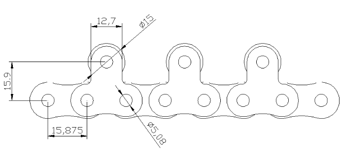 Cadena transportadora de rodillos superiores is basado en la cadena de rodillos ANSI y la cadena de rodillos de doble paso. Se monta un rodillo adicional en la parte superior de la línea de paso de la cadena para transportar materiales directamente sobre ellos. Los materiales se pueden cargar, retirar o detener temporalmente mientras cadena Está en funcionamiento continuo. Los clientes pueden especificar el espacio del rodillo superior.